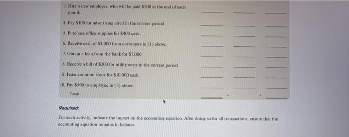 Pay 100 for current months rent. For each activity indicate the impact on the accounting equation. After doing so for all transactions ensure that the.