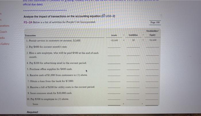 The first item is provided as an example. Below is a list of activities for Purple Cow Incorporated. Problem 2-2A Analyze the impact of transactions on the accounting equation LO2-2 Below is a list of activities for Purple Cow Incorporated.